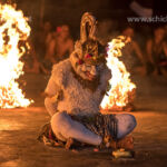 Affengott Hanuman zwischen Flammen bei der Aufführung des klassischen balinesischen Kecak-Tanz im Uluwatu-Tempel, Bali, Indonesien