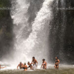 Touristen baden im Tegenungan Wasserfall bei Ubud, Bali, Indonesien | tourists enjoying a bath in the Tegenungan waterfall near Ubud, Bali, Indonesia