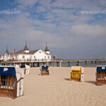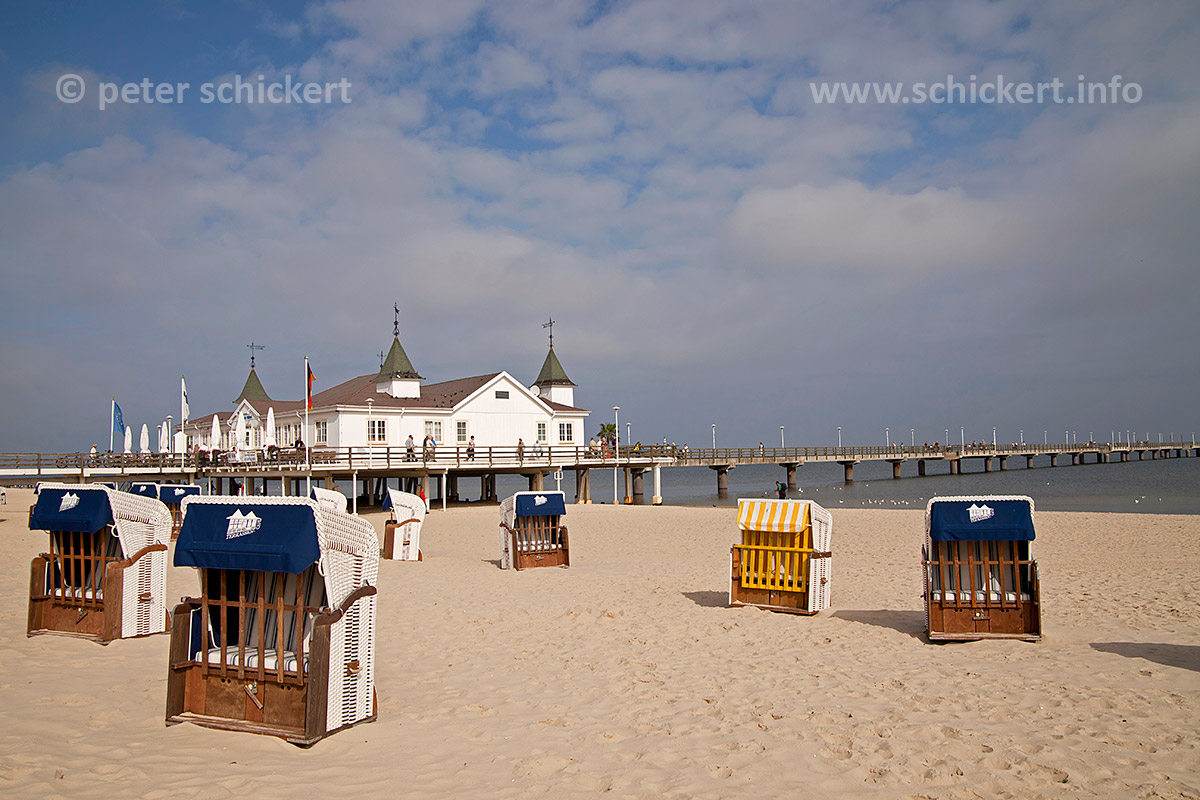 Strandkörbe und die Seebrücke am Osteestrand des Seebad Ahlbeck, Insel Usedom, Mecklenburg-Vorpommern, Deutschland | Beach chairs “ Strandkorb “ and the Seebrücke or Pier at the baltic beach of the seaside resort Ahlbeck, Usedom island, Mecklenburg-Vorpommern, Germany