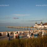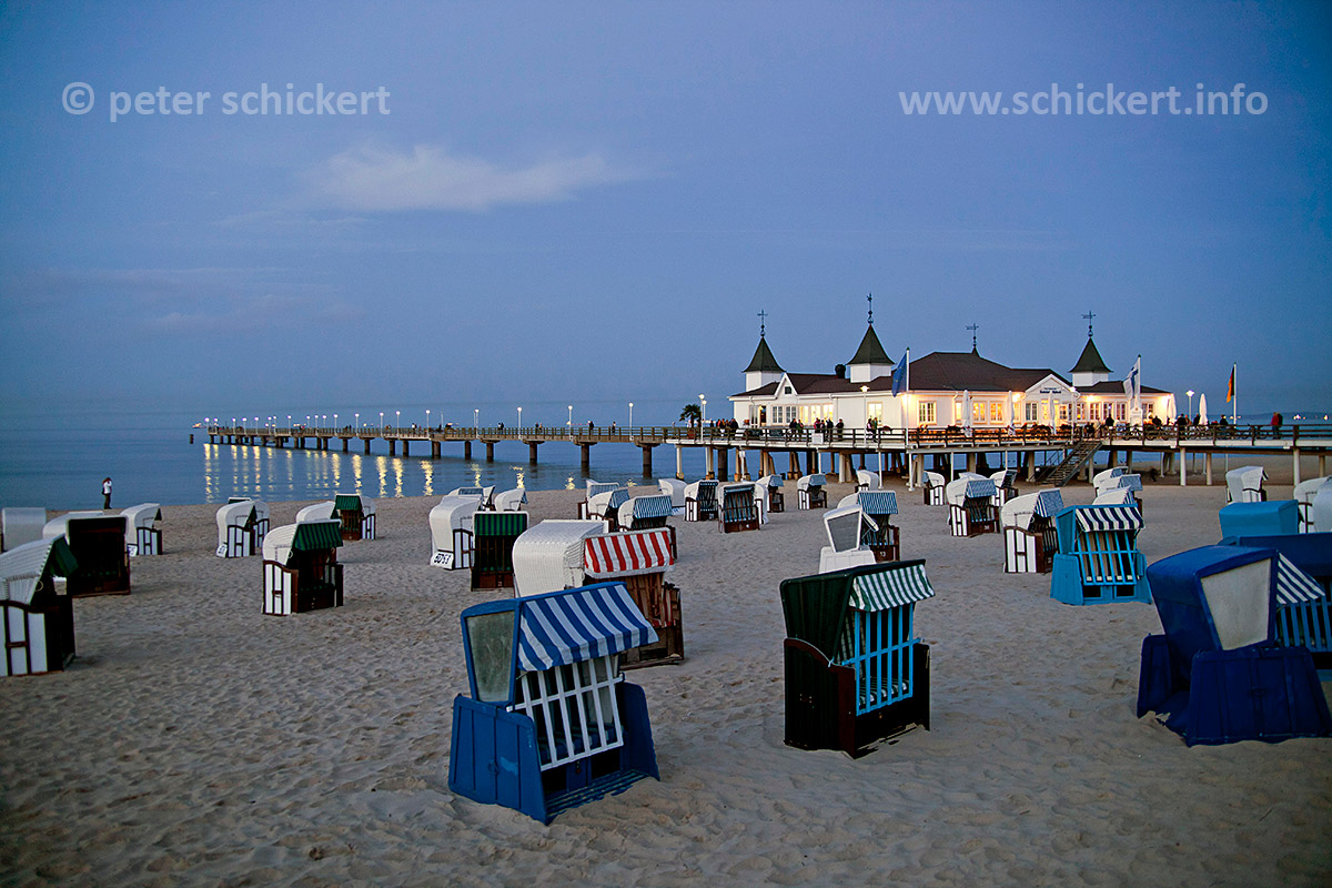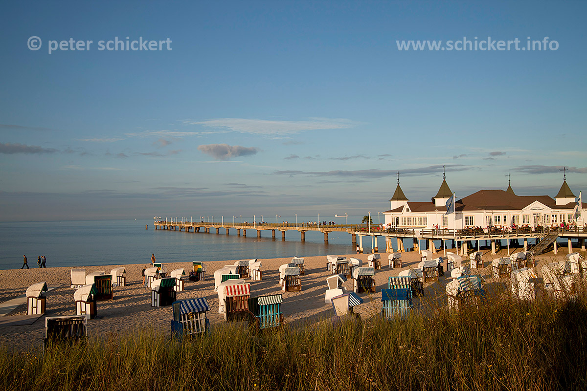 Strandkörbe und die Seebrücke am Osteestrand des Seebad Ahlbeck am Abend, Insel Usedom, Mecklenburg-Vorpommern, Deutschland | Beach chairs “ Strandkorb “ and the Seebrücke or Pier at the baltic beach of the seaside resort Ahlbeck in the evening, Usedom island, Mecklenburg-Vorpommern, Germany
