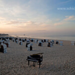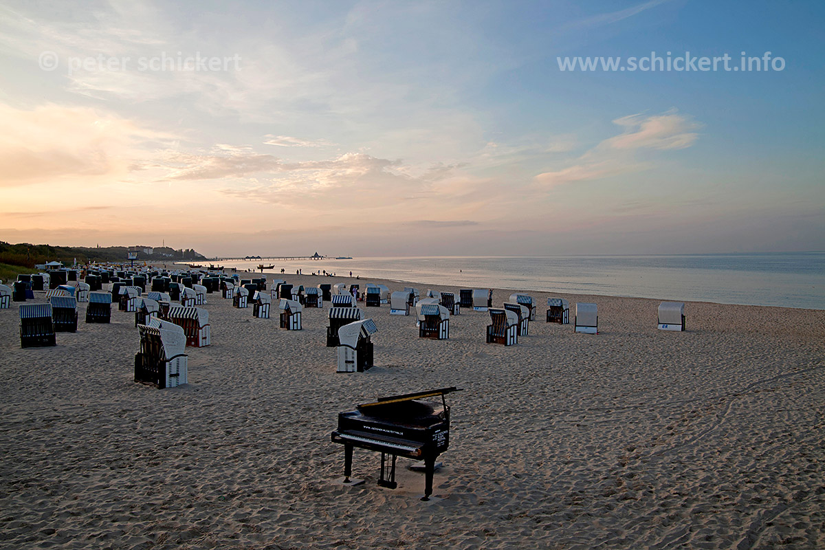 Strandkörbe und ein Konzertflügel, Werbung für das Usedomer Musik Festival am Osteestrand des Seebad Ahlbeck, Insel Usedom, Mecklenburg-Vorpommern, Deutschland | Beach chairs “ Strandkorb “ and a Grand Piano at the baltic beach of the seaside resort Ahlbeck, Usedom island, Mecklenburg-Vorpommern, Germany