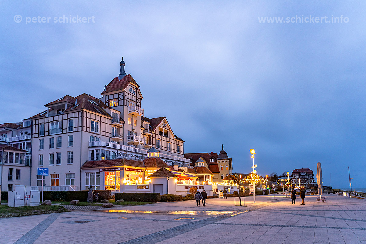 Ostsee Promenade am Baltic Platz im Ostseebad Kühlungsborn in der Abenddämmerung, Mecklenburg-Vorpommern, Deutschland | Baltic square promenade in Kühlungsborn at dusk, Mecklenburg-Vorpommern, Germany