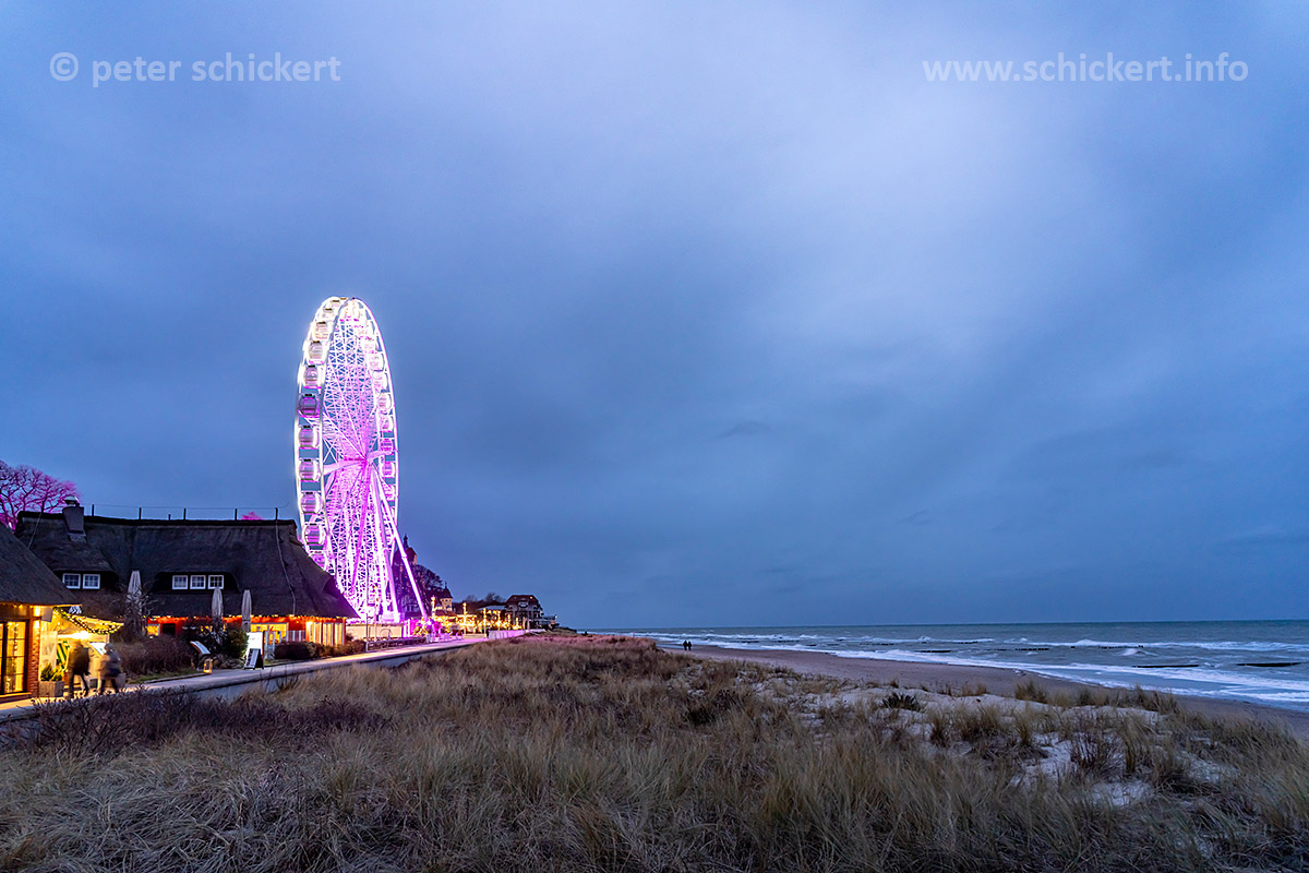 Ostseestrand und Riesenrad im Ostseebad Kühlungsborn in der Abenddämmerung, Mecklenburg-Vorpommern, Deutschland | Baltic beach and Ferris wheel in Kühlungsborn at dusk, Mecklenburg-Vorpommern, Germany