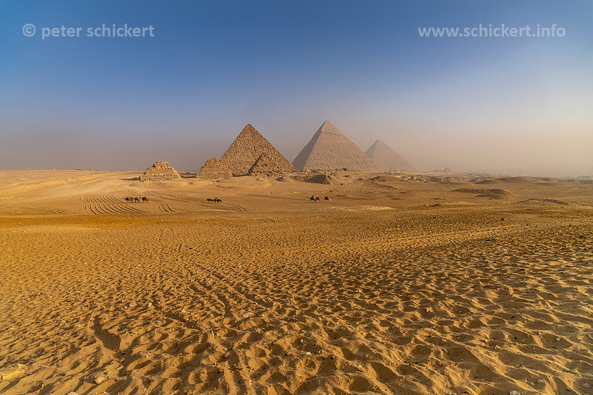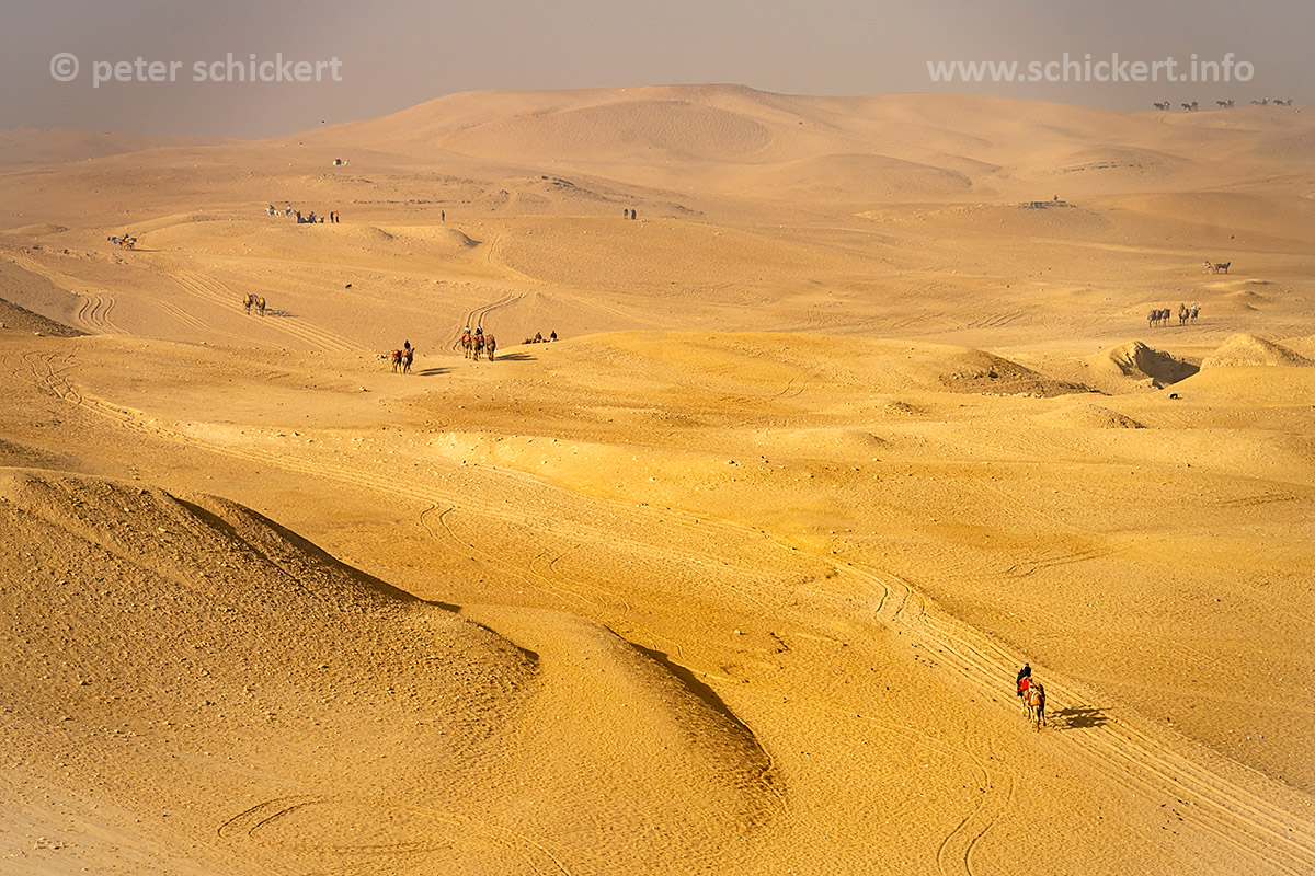 Kamele und Touristen in der Wüste bei den Pyramiden von Gizeh, Ägypten, Afrika | Camels with Tourists in the desert at the pyramids in Giza, Egypt, Africa