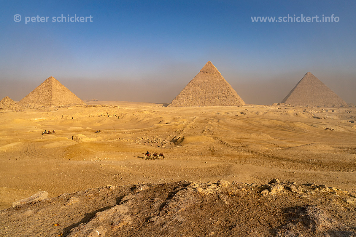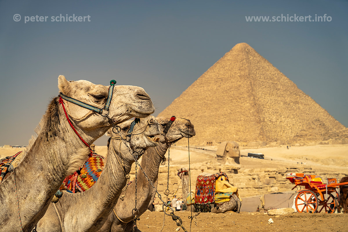 Kamele in der Wüste bei den Pyramiden von Gizeh, Ägypten, Afrika | Camels in the desert at the pyramids in Giza, Egypt, Africa