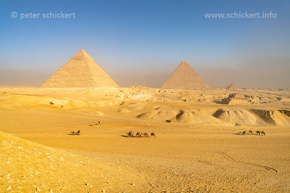 Kamele in der Wüste und die Pyramiden von Gizeh, Ägypten, Afrika | Camels in the desert and the pyramids in Giza, Egypt, Africa
