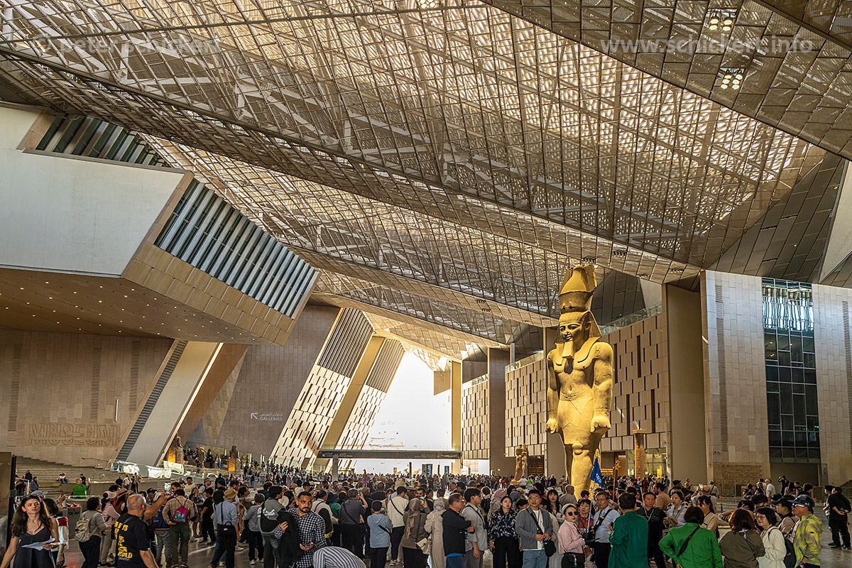 Kolossalstatue Ramses‘ II. in der Eingangshalle des Grand Egyptian Museum in Gizeh, Ägypten, Afrika | Grand Hall (Atrium) with statue of Pharaoh Ramesses II, Grand Egyptian Museum interior, Giza, Egypt, Africa