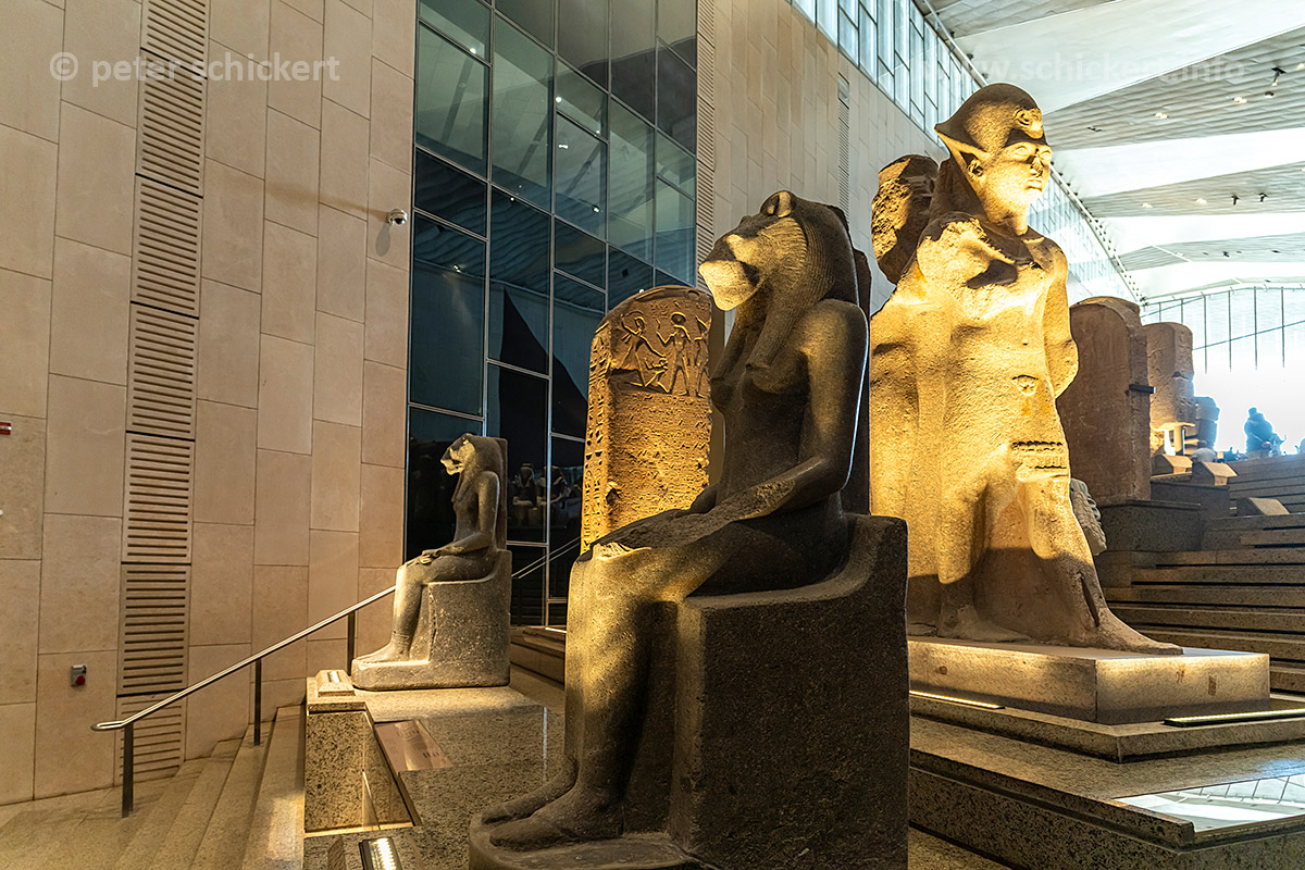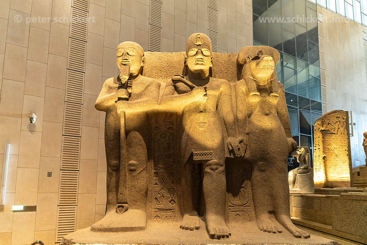 Statuengruppe mit Pharao Ramses II., Schöpfergott Ptah und der Löwengöttin Sekhmet im Grand Egyptian Museum in Gizeh, Ägypten, Afrika | Statue of God Ptah, King Ramesses II and Goddess Sekhmet, Grand Egyptian Museum, Giza, Egypt, Africa