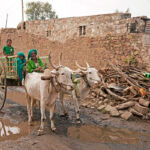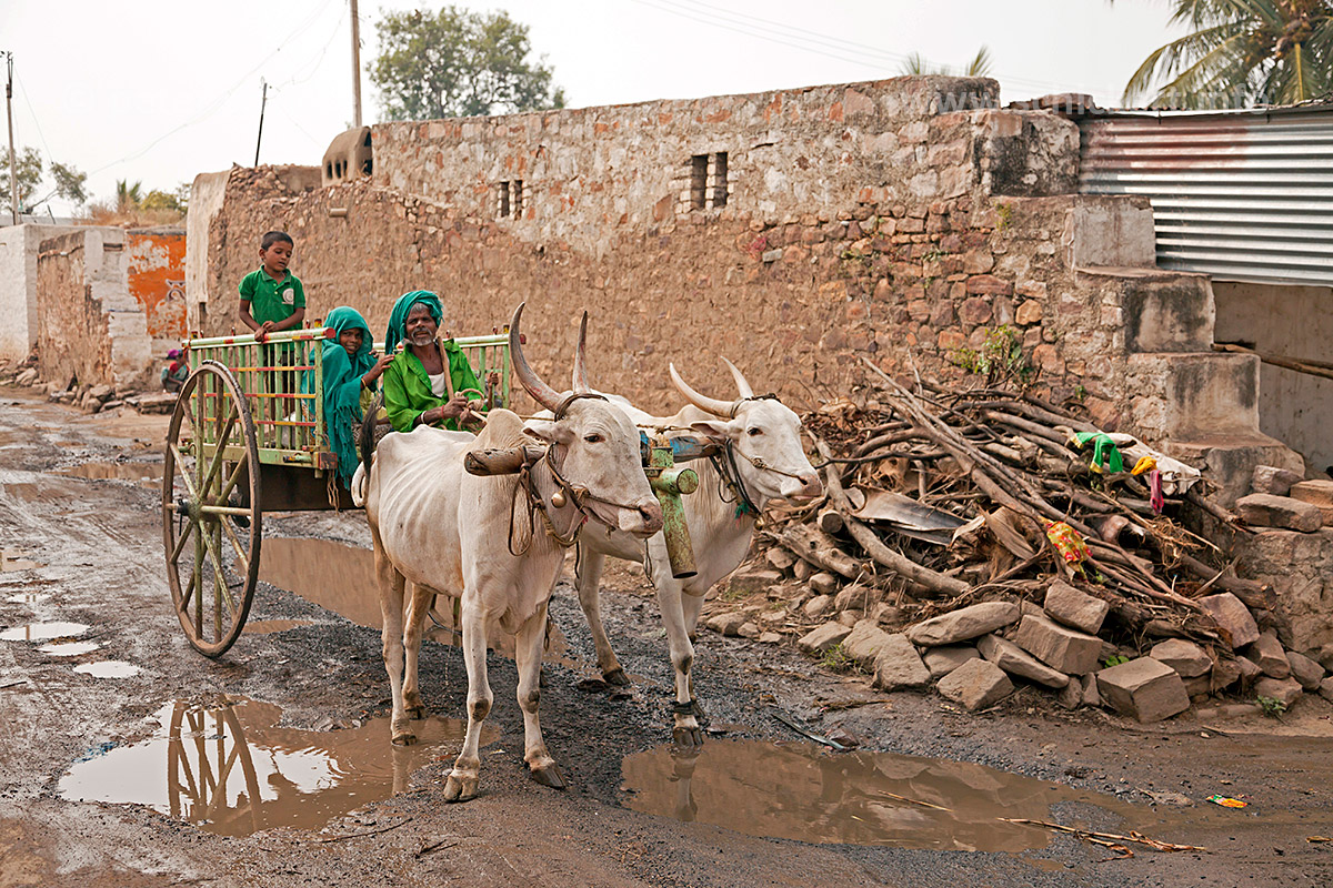 Bauer mit Kindern und Ochsenkarren im Dorf Aihole, Karnataka, Indien, Asien | farmer with children and ox cart, Aihole, Karnataka, India, Asia