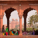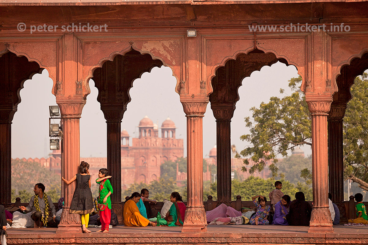Säulengang im Innenhof der Freitagsmoschee Jama Masjid, im Hintergrund das Rote Fort, Delhi, Indien, Asien | Colonnade in the courtyard of the Friday Mosque Jama Masjid, the Red Fort at the back, Delhi, India, Asia