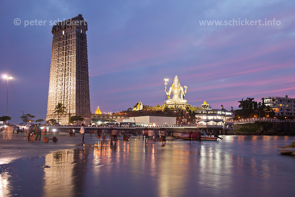 riesiger Gopuram und Statue von Lord Shiva des Murudeshwar Tempel bei Nacht, Murudeshwar, Karnataka, Indien, Asien | giant gopura and Lord Shiva statue at Murudeshwar temple at night, Murudeshwar, Karnataka, India, Asia