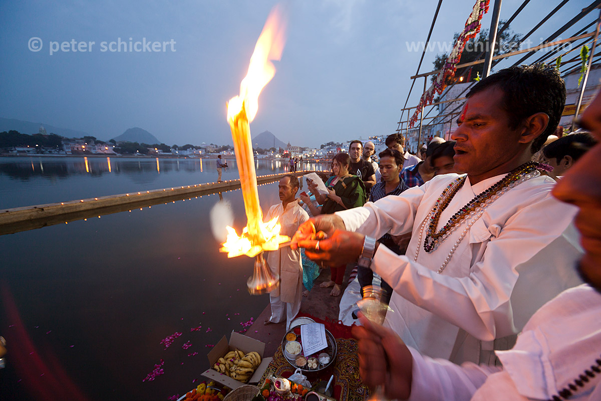 Brahmane bei einer religiösen Zeremonie Aarti und Deepdan mit Ölleuchte am heiligen Pushkar See während der Pushkar Mela in Pushkar, Rajasthan, Indien, Asien | Brahmin priest with oil lamp during a religious ceremony Aarti and Deepdan at the holy Pushkar Lake, Pushkar Fair or Pushkar Mela, Pushkar, Rajasthan, India, Asia
