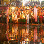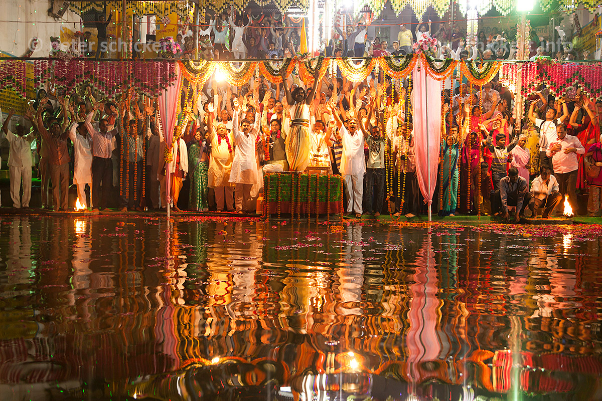 Gläubige Hindus bei einer religiösen Zeremonie Aarti und Deepdan am heiligen Pushkar See während der Pushkar Mela in Pushkar, Rajasthan, Indien, Asien | Hindu worshippers during a religious ceremony Aarti and Deepdan at the holy Pushkar Lake, Pushkar Fair or Pushkar Mela, Pushkar, Rajasthan, India, Asia