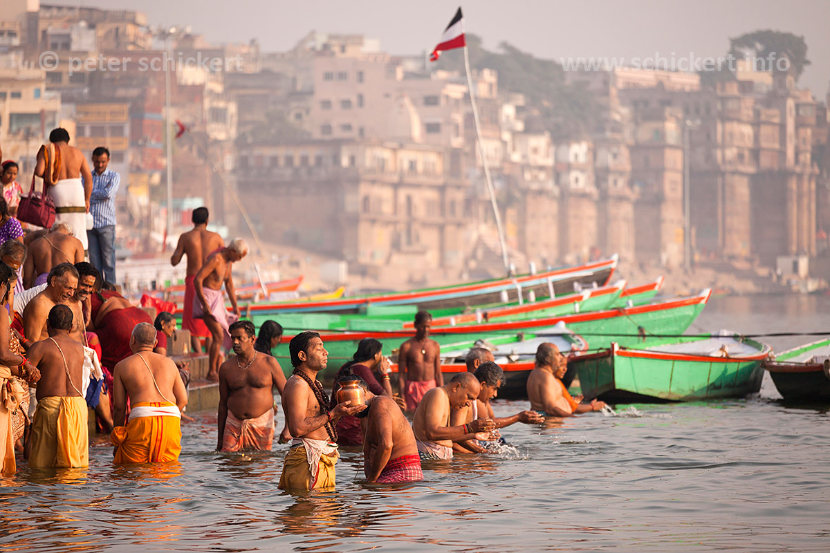 Gäubige Hindus beim morgentlichen Bad im Ganges, Varanasi, Uttar Pradesh, Indien, Asien | hindu worshippers bathing in the Ganga river, Varanasi, Uttar Pradesh, India, Asia