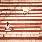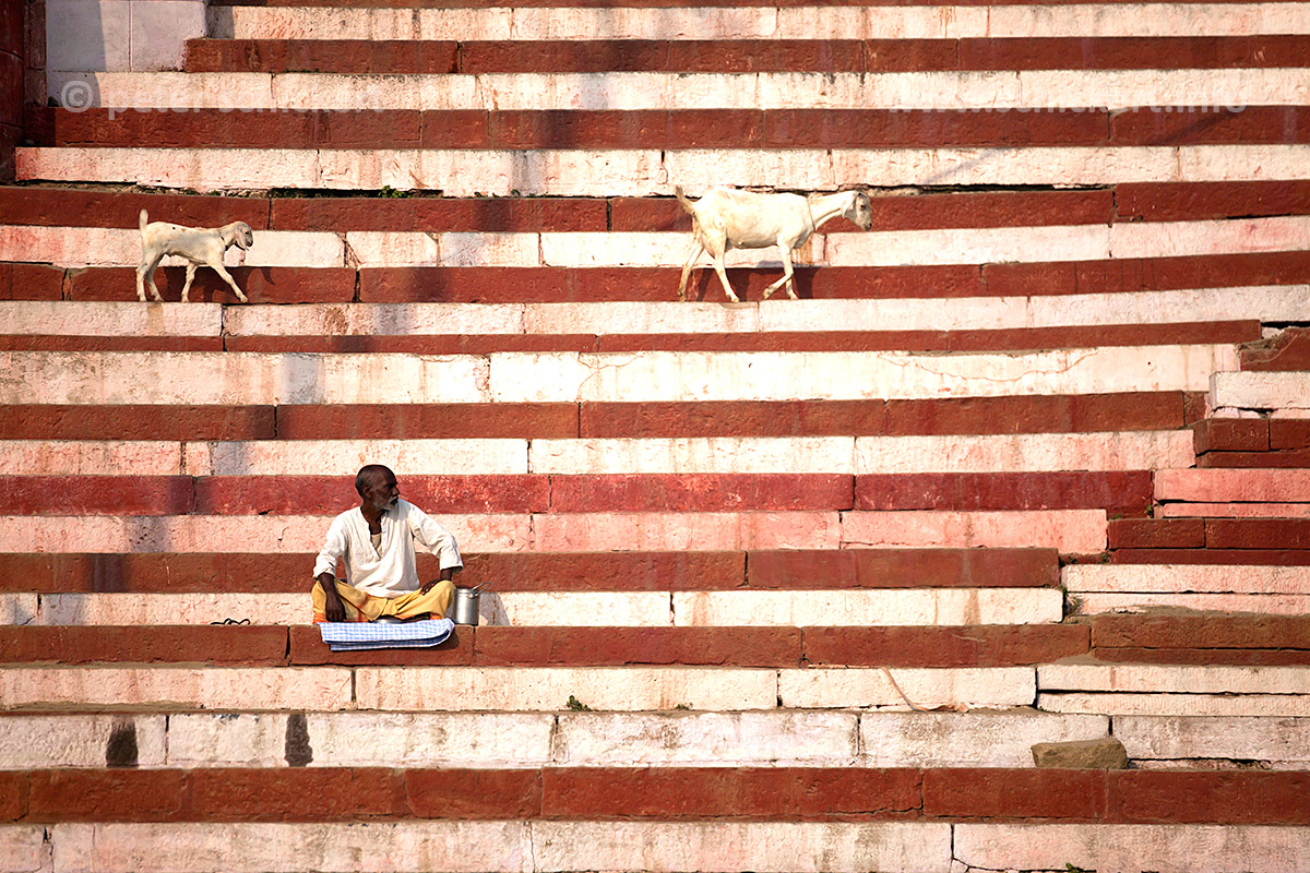 Mann und zwei Ziegen auf einer rot weissen Treppe der Ghats in Varanasi, Uttar Pradesh, Indien, Asien | Man and 2 goats on the red white ghat stairs in Varanasi, Uttar Pradesh, India, Asia