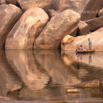 Coracle Boot zwischen Granitfelsen am Fluss Tungabhadra bei Hampi, Karnataka, Indien, Asien | coracle boat and granite boulders at the Tungabhadra river near Hampi, Karnataka, India, Asia