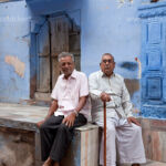 ältere Männer vor typischer blauer Fassade in Jodhpur, Rajasthan, Indien, Asien | elderly man and typical blue facade in Jodhpur, Rajasthan, India, Asia