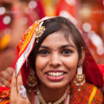 Portrait einer jungen Frau in der typischen farbenfrohen Tracht der Rajasthanis beim Kamel- und Viehmarkt Pushkar Mela in Pushkar, Rajasthan, Indien, Asien | portrait of a young woman in their typical colourful traditional dress at the camel and livestock fair Pushkar Fair or Pushkar Mela, Pushkar, Rajasthan, India, Asia