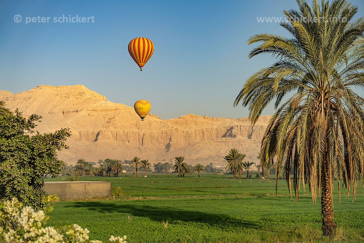 Heissluftballons mit Touristen über dem antiken Theben bei Luxor, Ägypten, Afrika | Tourist hot air balloons over ancient Thebes near Luxor, Egypt, Africa