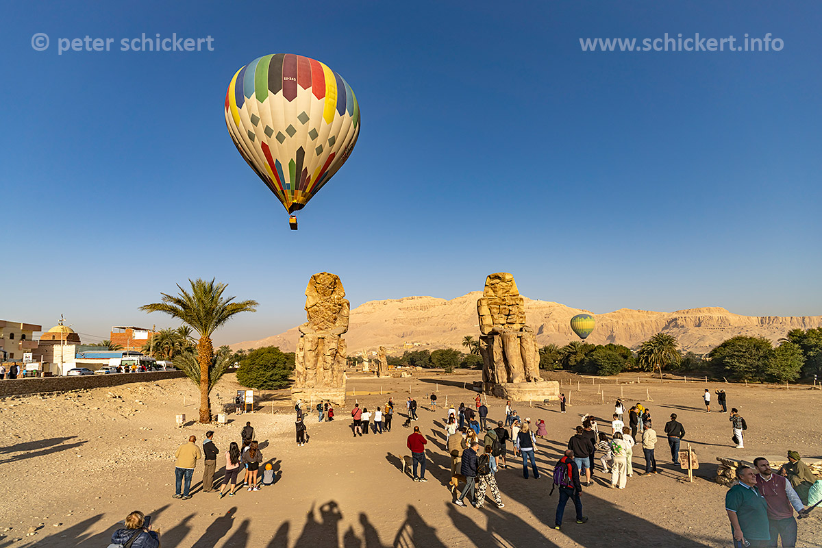 Reisegruppen und Heiisluftballon bei den Memnonkolossen im Niltal in Theben-West bei Luxor, Ägypten, Afrika | Tourist Groups and a hot air balloon at the Colossi of Memnon in Thebes near Luxor, Egypt, Africa