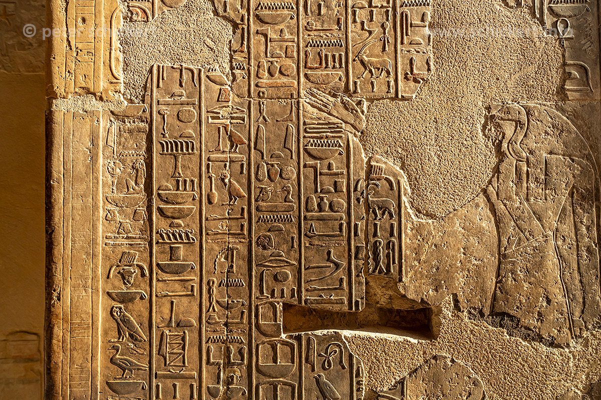 Hieroglyphen im Totentempel der Hatschepsut und des Mentuhotep II in Deir el-Bahari, Theben West bei Luxor, Ägypten, Afrika | Hieroglyphs at the Mortuary temple of Hatshepsut and Nebhepetre Mentuhotep in Deir el-Bahari or Dayr al-Bahri, Thebes near Luxor, Egypt, Africa