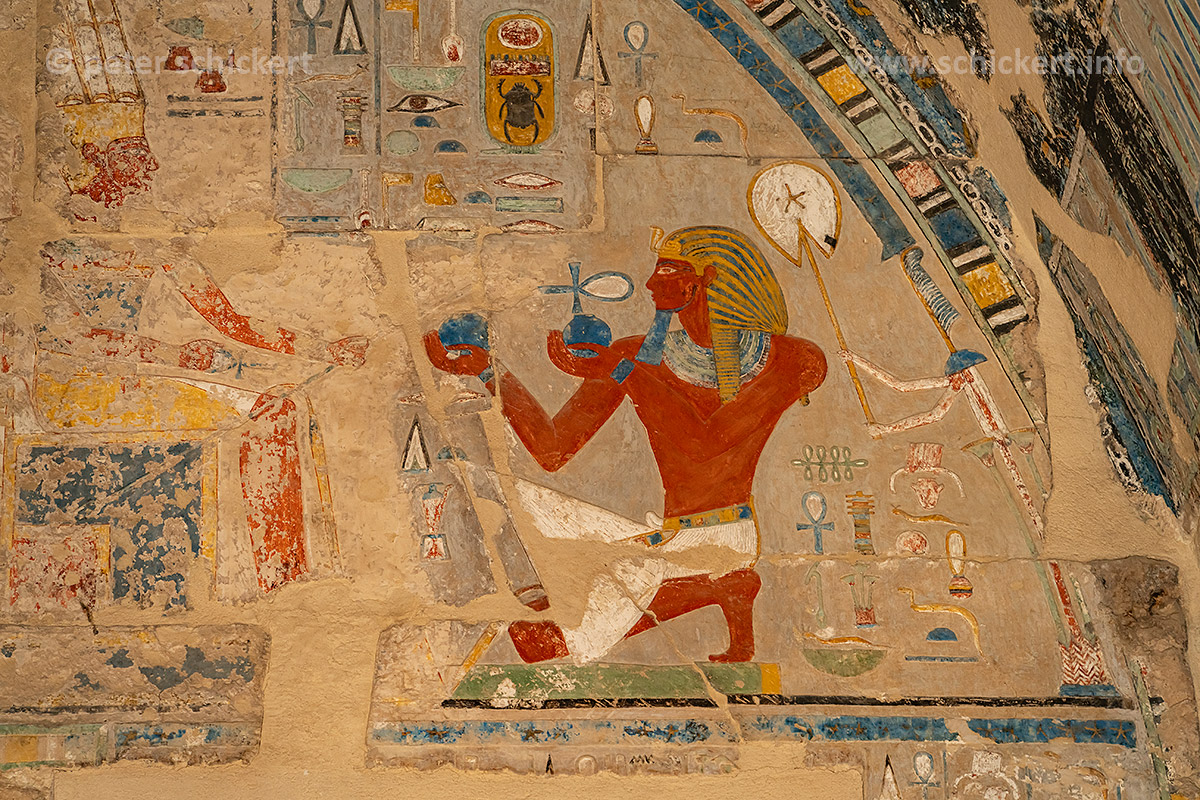 Altägyptische Wandmalerei im Totentempel der Hatschepsut und des Mentuhotep II in Deir el-Bahari, Theben West bei Luxor, Ägypten, Afrika | Ancient Egyptian wall painting at the Mortuary temple of Hatshepsut and Nebhepetre Mentuhotep in Deir el-Bahari or Dayr al-Bahri, Thebes near Luxor, Egypt, Africa