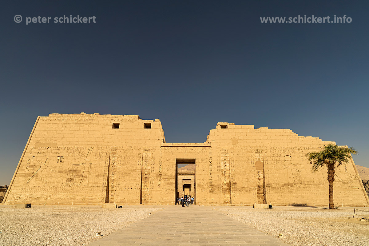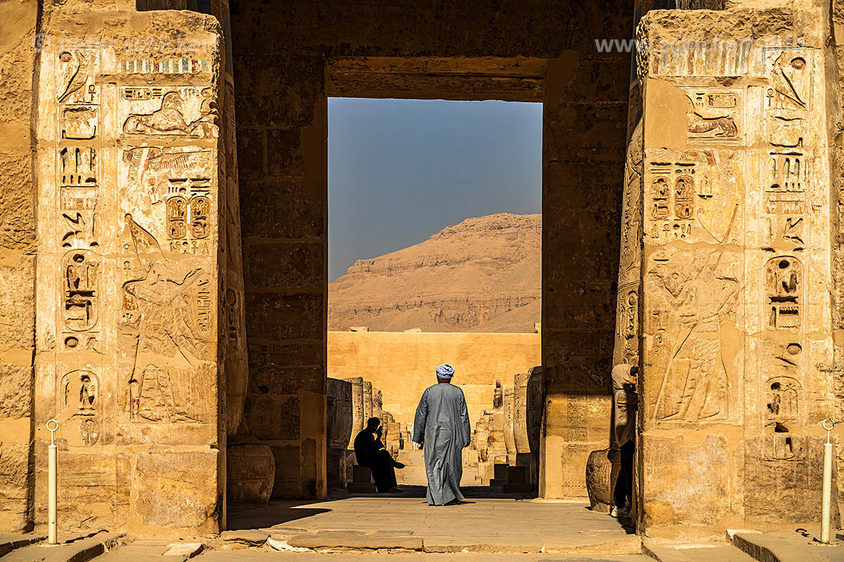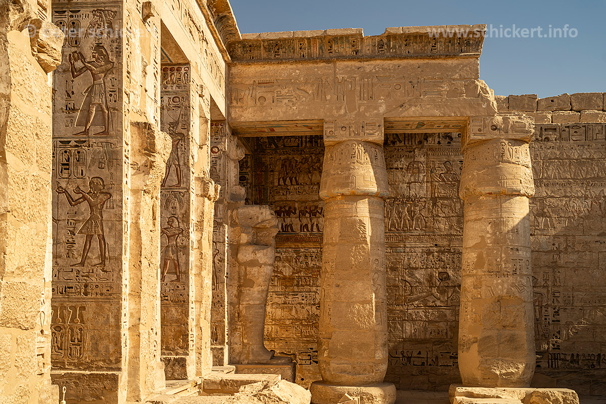 Säulen und Mauern mit Reliefs des Totentempel des Ramses III. in Medinet Habu, Theben-West bei Luxor, Ägypten, Afrika | Columns and wall with reliefs at the Mortuary Temple of Ramesses III in Medinet Habu, Thebes near Luxor, Egypt, Africa