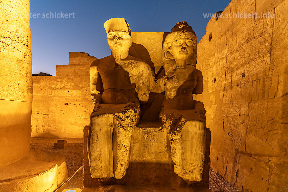 Statuen der Götter Amun und Mut im Luxor-Tempel in Luxor in der Abenddämmerung, Ägypten, Afrika | A double statue of Amun and Mut at the Luxor Temple in Luxor at dusk, Egypt, Africa