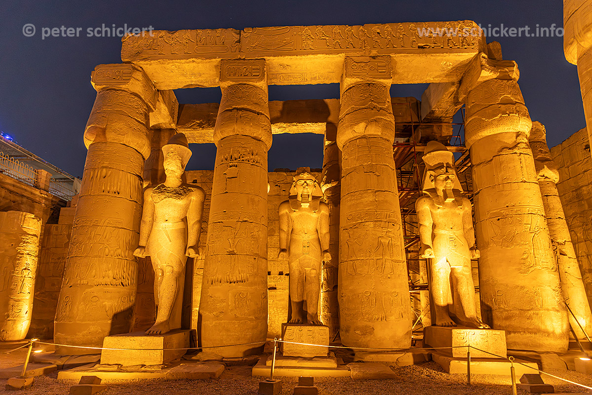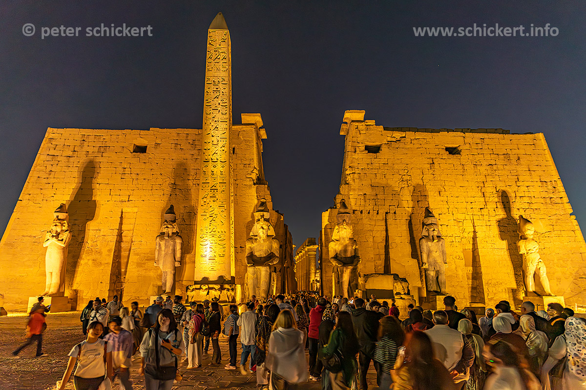 Oblisk, Pylon and Ramses Statuen im Luxor-Tempel in Luxor in der Abenddämmerung, Ägypten, Afrika | Oblisk, Pylon and Statues of Ramesses at the Luxor Temple in Luxor at dusk, Egypt, Africa