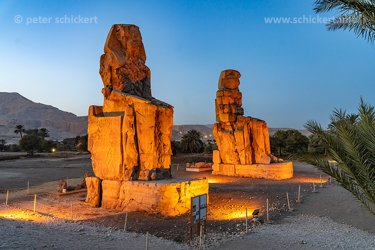 Die Memnonkolosse im Niltal in Theben-West bei Luxor in der Abenddämmerung, Ägypten, Afrika | The Colossi of Memnon in Thebes near Luxor at dusk, Egypt, Africa